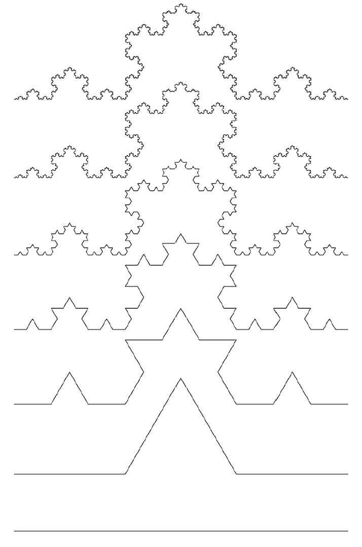 La curva de Koch se construye eliminando de un segmento su tercio central que es sustituido por los lados de un triángulo equilátero sin base y así sucesivamente en un proceso iterativo infinito en cada nuevo segmento.