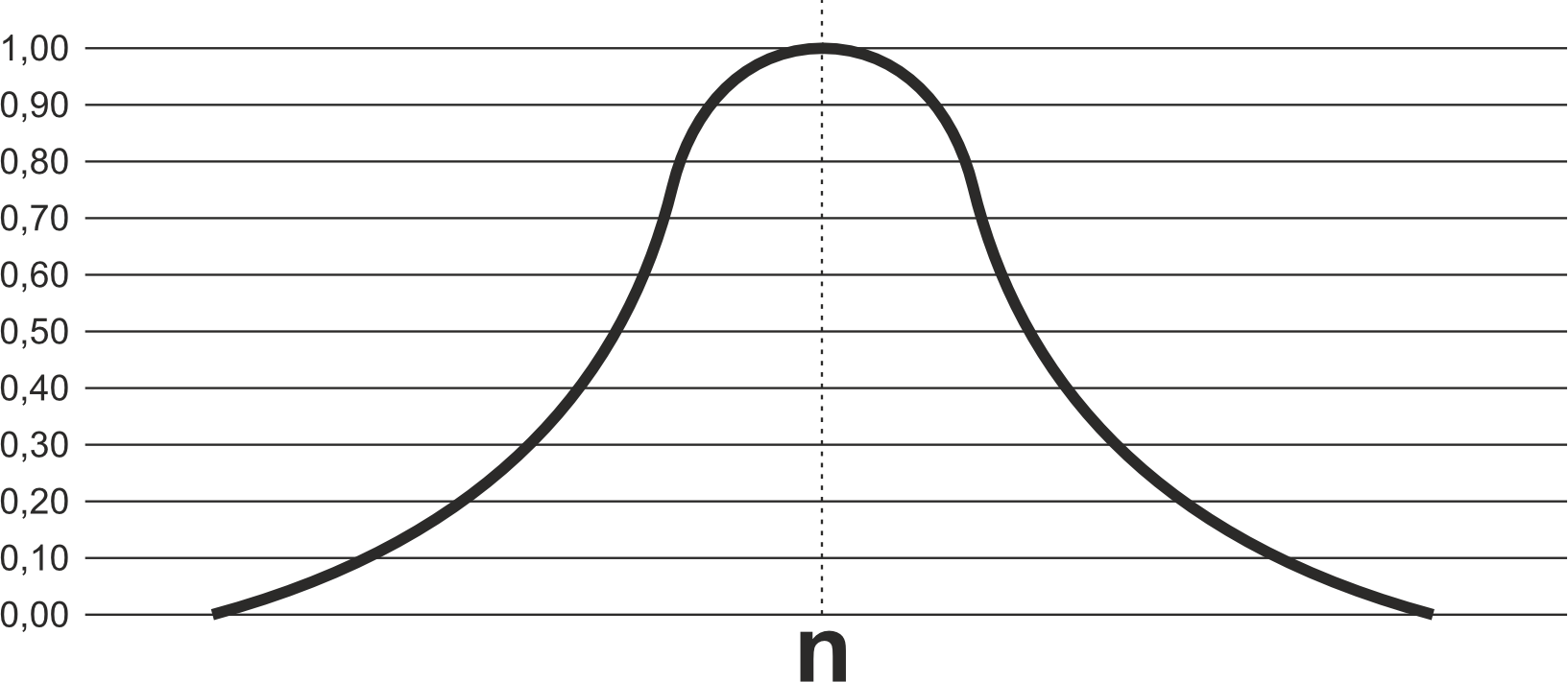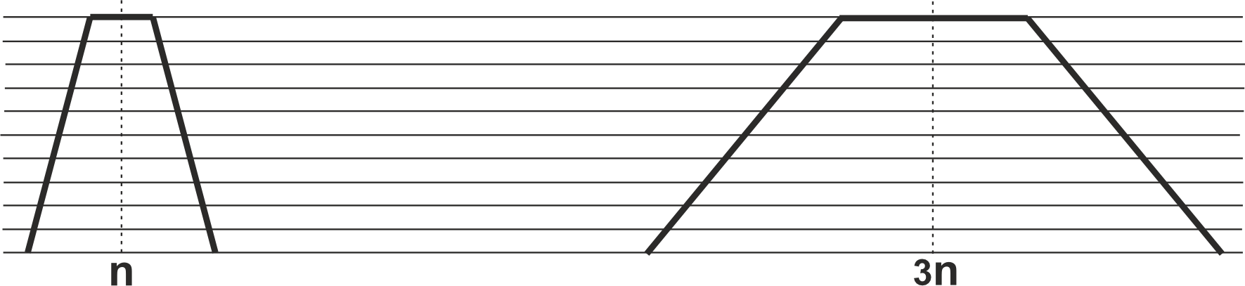 Del producto de un número no borroso por uno borroso se obtiene un número borroso. Aquí vemos el producto del número borroso n por el número 3. El intervalo de borrosidad de n queda aumentado a tres veces el tamaño del de n y el número borroso resultante es 3n.