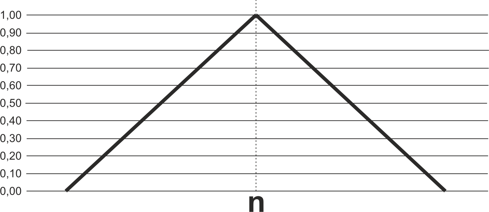 Dos tipos de función de pertenencia o de números borrosos se presentan, según ocasiones, en las cotizaciones. Ambas tienen una forma que he esquematizado aquí como trapezoidal. En la primera el número que identifica al borroso está en el centro del intervalo de la función de pertenencia, siendo un trapecio isósceles y en la segunda forma está inmediatamente pegado al inicio del intervalo, siendo un trapecio escaleno, casi un trapecio rectangular.