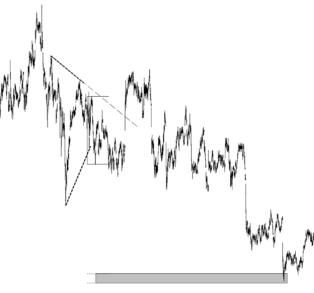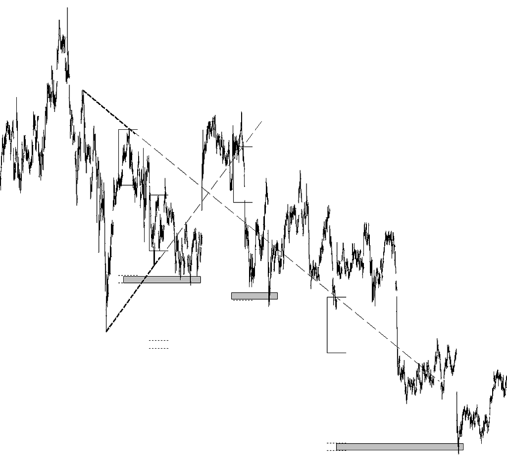 En ocasiones encontraremos una expansiva descendente cuyo punto 5 esté por arriba de su punto 3, pudiendo también encontrar quizáuna o varias contractivas simétricas en ella. Puede que el siguiente ejemplo sea clarificador y aunque muestra objetivos bajistas también ocurre que puedan ser objetivos alcistas e incluso que la expansiva proporcione bajistas y la contractiva simétrica alcistas.