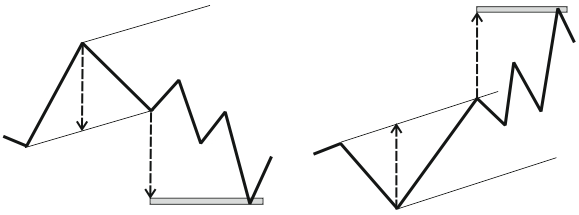 La distancia en precio (en vertical) desde un máximo (mínimo) relativo a la directriz o contradirectriz que une el mínimo (máximo) relativo anterior con el posterior trasladada al segundo mínimo (máximo) relativo de la directriz o contradirectriz es un objetivo de precio. Por tanto, hay una homotecia del ancho (en vertical) de un supuesto canal no formado.