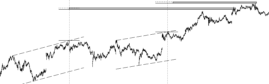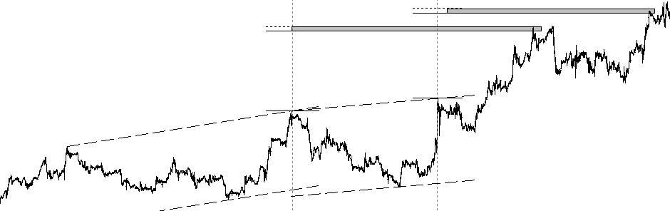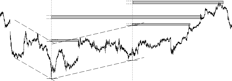 Un canal según el análisis técnico es la unión mediante sendas rectas paralelas de dos o más máximos (mínimos) relativos alternados por mínimos (máximos) relativos. Partiendo de un máximo (mínimo) relativo y encontrando después un mínimo (máximo) relativo y con posterioridad otro máximo (mínimo) relativo que podemos unir mediante una línea al anterior máximo (mínimo) relativo y sacar una paralela a tal línea que emplazamos en el mínimo (máximo) podemos intuir la formación de un posible canal. Cuando la cotización canaliza, lo que ocurre es que un mínimo (máximo) que faltaba se produce sobre la línea paralela a la de máximos (mínimos) que hemos emplazado en el mínimo (máximo) de en medio. Pero… ¿y si la cotización no canaliza?, es decir, si no produce un siguiente mínimo (máximo) relativo sobre la línea paralela. Es muy frecuente que no canalice, y es mucho más frecuente que tal situación reporte objetivos de precio según explico a continuación. Estos objetivos de precio son un aspecto de las muchas semejanzas fractales con distancias que existen en las cotizaciones, concretamente distancias a una directriz o una contradirectriz y que podemos considerar homotecias.