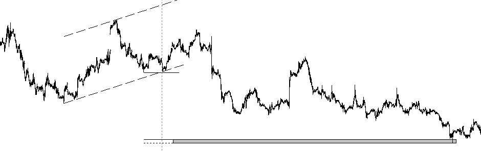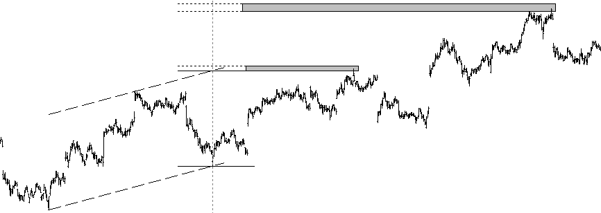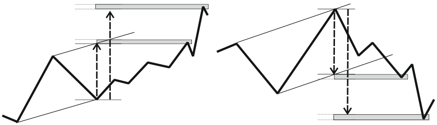 Hemos visto objetivos de precio yendo la cotización hacia el lado contrario al de la directriz o contradirectriz, hacia el lado de la paralela trazada, pero la cotización puede superar la directriz o contradirectriz y producir objetivos en ese lado. El proceso es similar al descrito cuando la cotización avanza hacia el lado donde está la paralela. La distancia vertical en precio entre la directriz o la contradirectriz y su paralela suele representar un objetivo de precio cuando tal distancia es trasladada al lado contrario de la paralela en el segundo máximo o mínimo que define la directriz o contradirectriz.