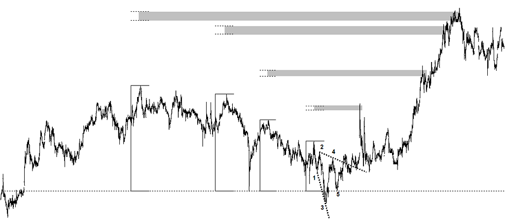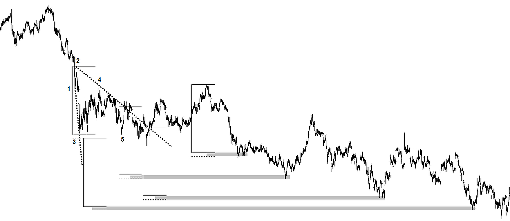 El final de tendencia bajista acaba en el punto 3 o en el punto 5, que explicaré. Por tal, cuando sospechemos que estemos ante un final de tendencia debemos explorar el mínimo que sería tal final, el anterior y el posterior, pues los dos primeros pueden ser respectivamente los puntos 3 y 5, o bien serlo el segundo y el tercero.