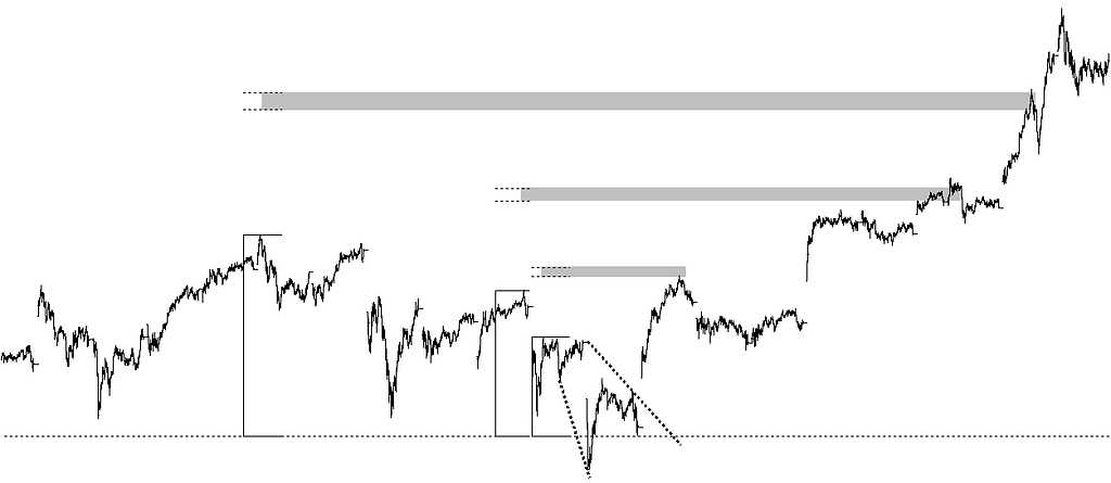 Objetivos por fallo en dos expansivas descendentes anidadas. De la grande se alcanza el primer objetivo por fallo y de la pequeña el primero, un segundo y el tercer objetivo por fallo.