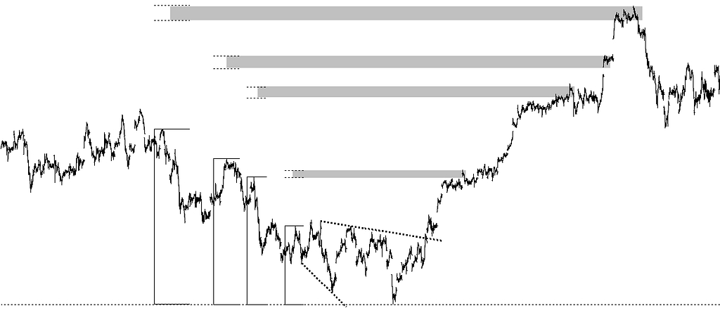 Los objetivos segundos de precio, homotecias de las diversas distancias d, se inicia por tanto en 1,61803d y los dibujo como franjas horizontales hasta 1,70217d.