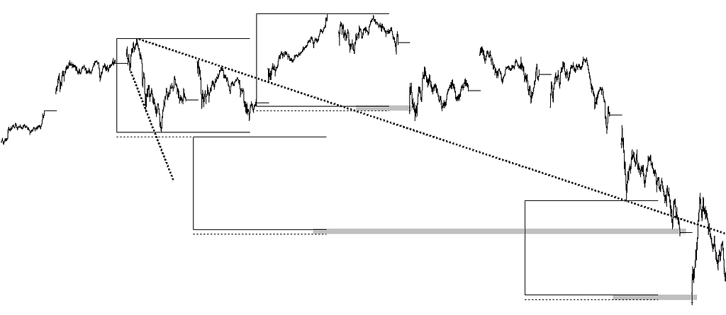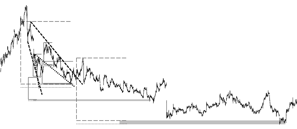Cuando una expansiva descendente se ha formado no sabemos si una tendencia ha terminado o no lo ha hecho. Podemos intuir por los objetivos de otras estructuras que generan la multifractalidad que se esté en el final de una y suponer objetivos alcistas, pero, veremos que es relativamente sencillo deducir prontamente si estamos errando y los objetivos serán bajistas porque la tendencia no haya terminado.