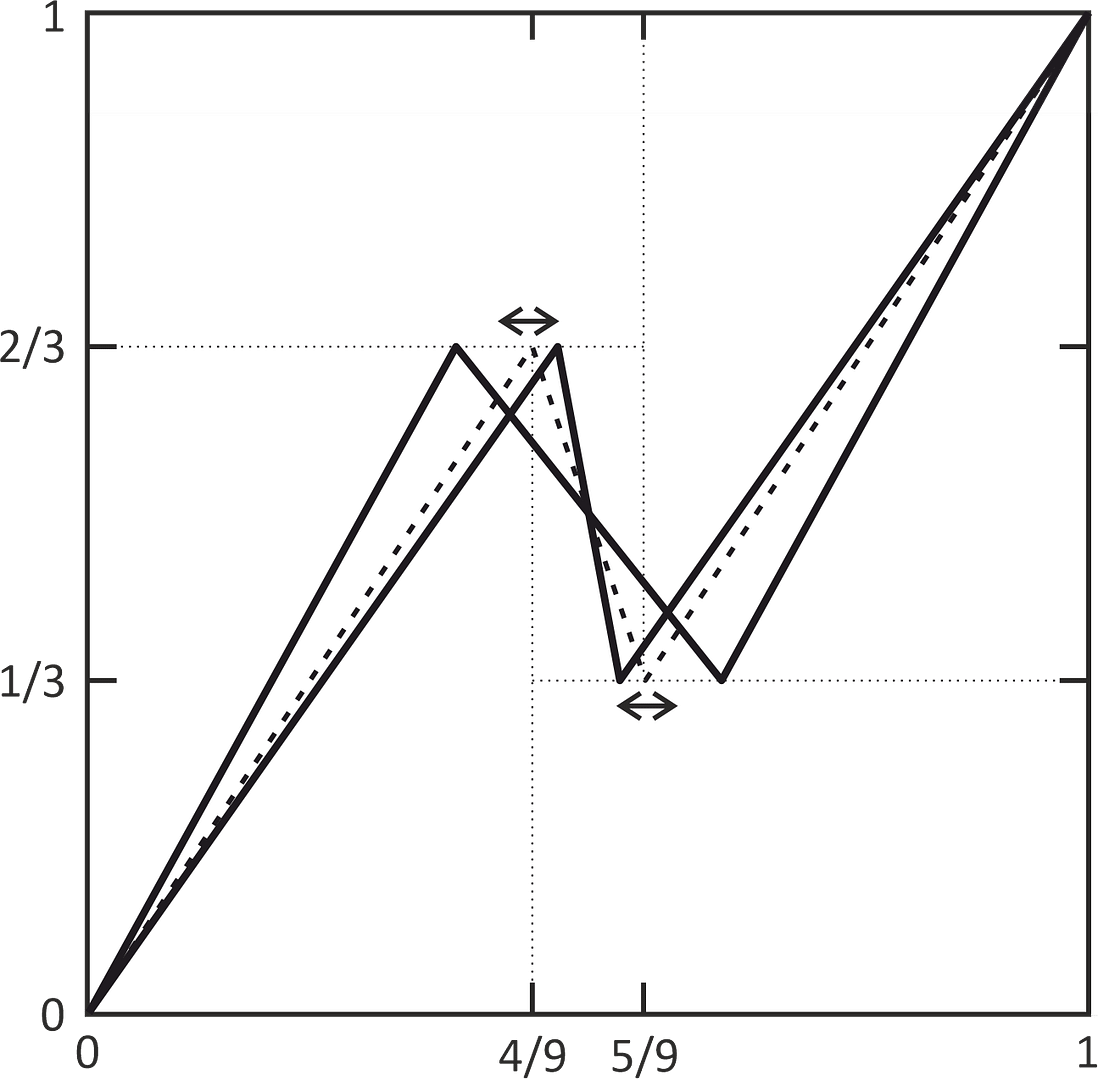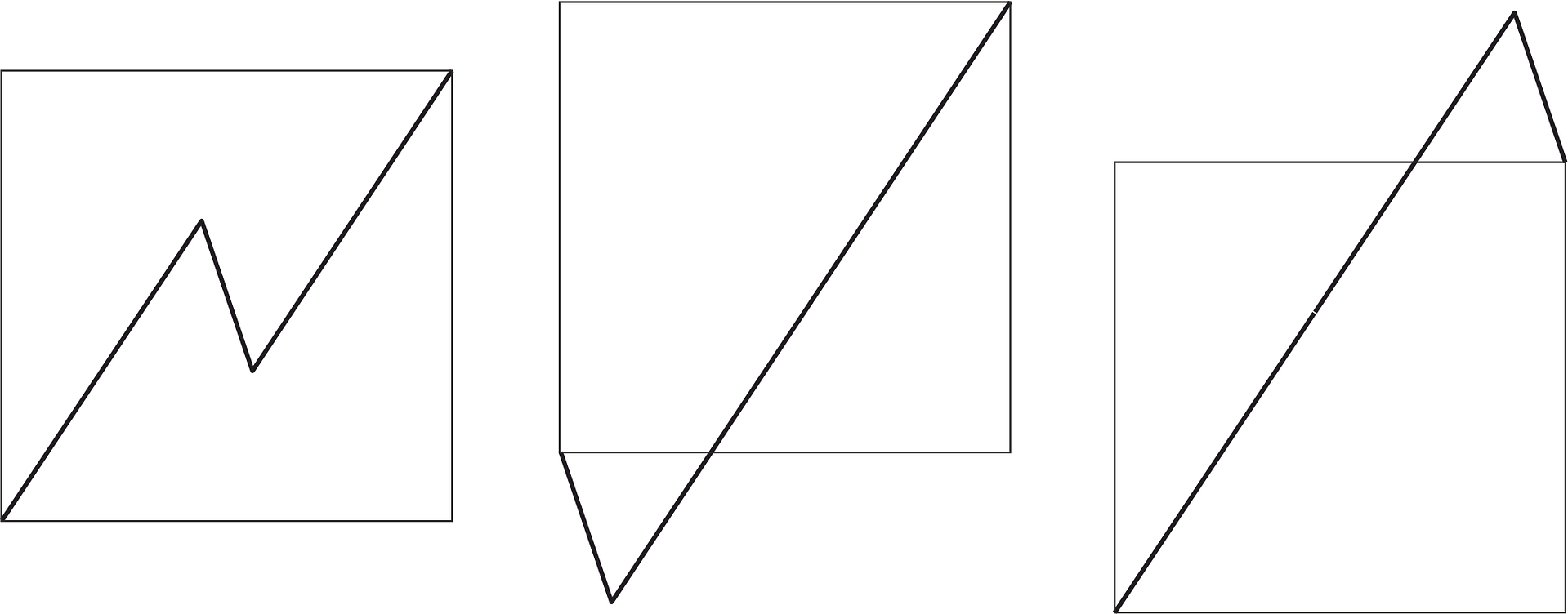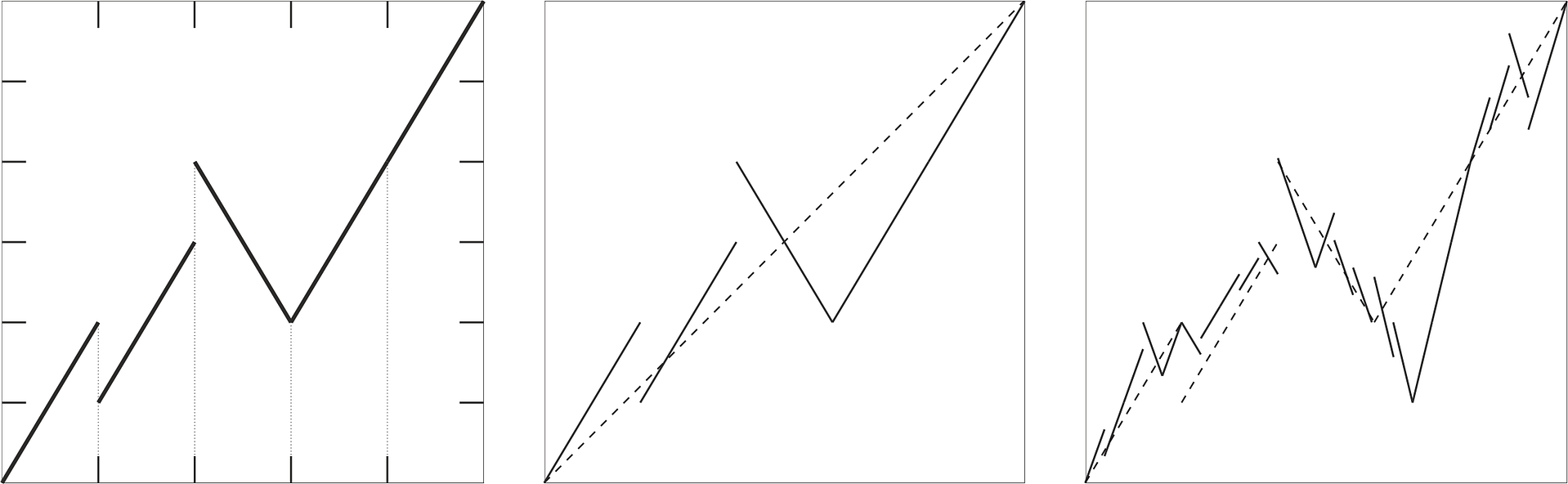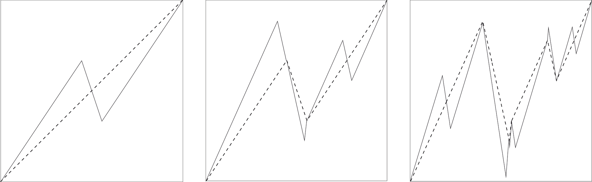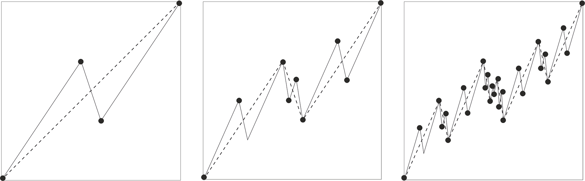 Ejemplo de cartón con tres iteraciones que reproduce el ruido browniano y que ha introducido aleatoriedad. Con ello desaparecen los puntos invariantes salvo el origen y final (esquina inferior izquierda y esquina superior derecha).