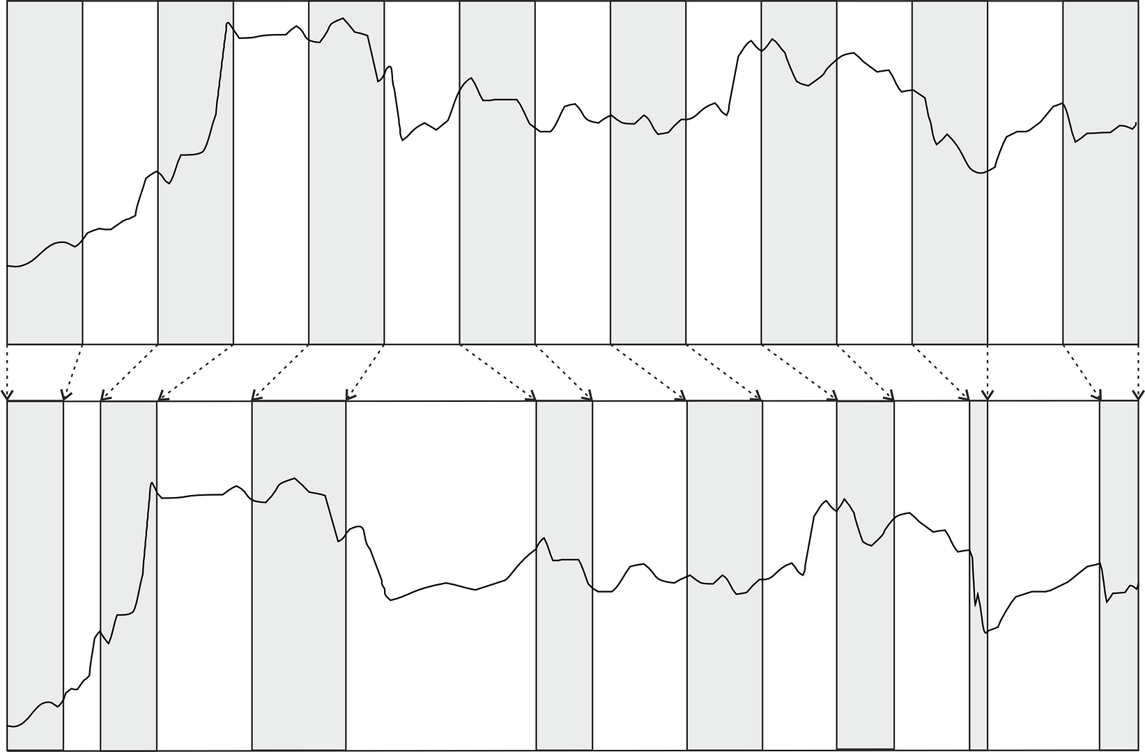 Quizá sea más comprensible tomar un fragmento de una cotización de un cartón madre en el que sí hay aleatoriedad y expandir y comprimir zonalmente este según un tiempo mercantil (padre), obteniendo el mismo resultado hijo sin proceder a proyectar el plano madre y padre al plano bisectriz. Una vez se ha expandido y comprimido zonalmente una ficticia cotización por el tiempo mercantil dejamos que con su forma el tiempo se reestablezca a tiempo real.
