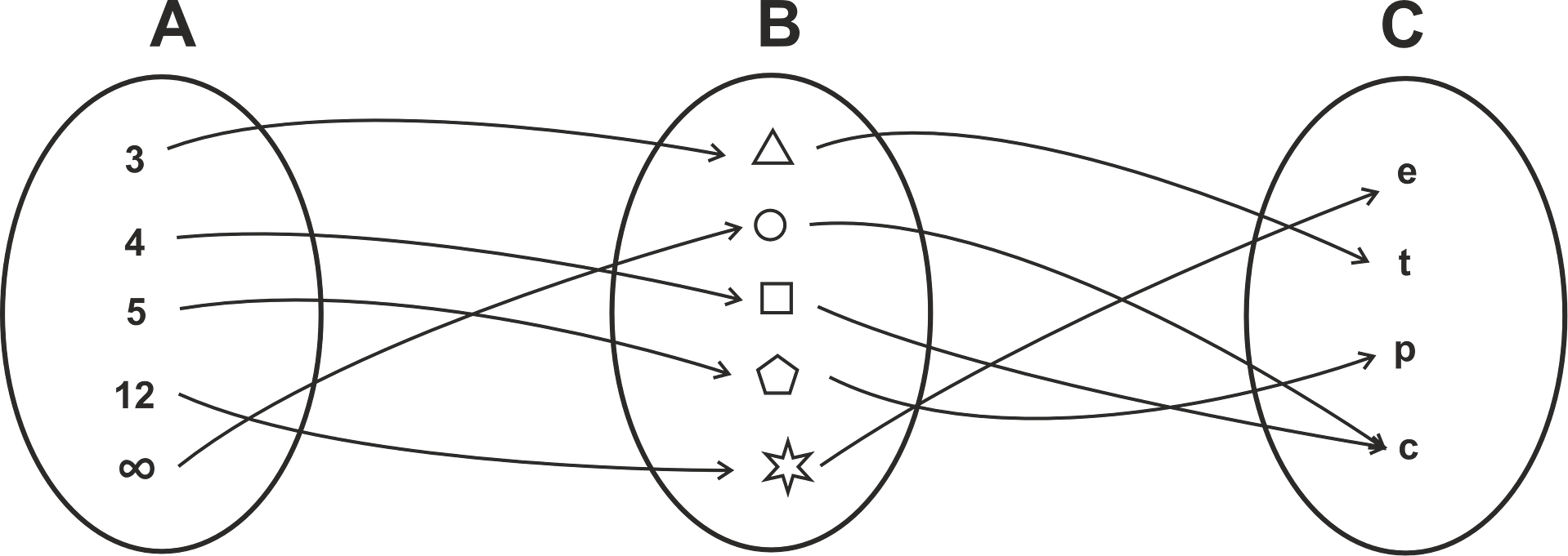 Tenemos las aplicaciones f:A→B y g:B→C, con f(número)= figura con ese número de vértices y con g(figura) = letra con la que comienza el nombre de la figura. La composición de aplicaciones que muestra este gráfico es (g ͦ f):A→C. Primero se aplica f y después se aplica g. Así, (g ͦ f)(ꝏ) = g(f(ꝏ)) = g(Օ) =c.