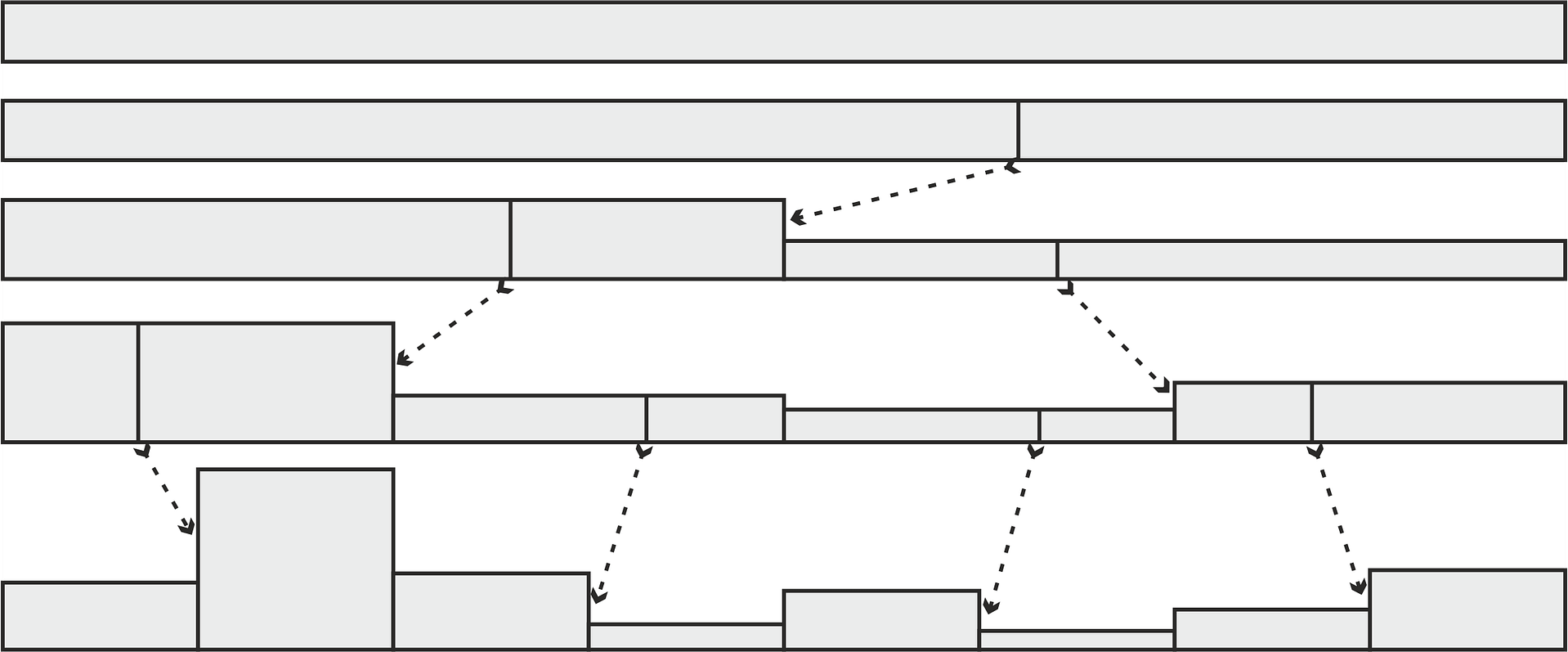 Cuatro primeras iteraciones de una cascada multiplicativa en la que la división de cada rectángulo se ha hecho dividiendo en un 65% y un 35% su longitud o en un 35% y un 65%. Después de cada división cada rectángulo es retamañado en su longitud para que todos tengan la misma, pero manteniendo su área, de modo que crecen o decrecen en altura. Después se repite el mismo proceso de división y de retamañado iterativamente.