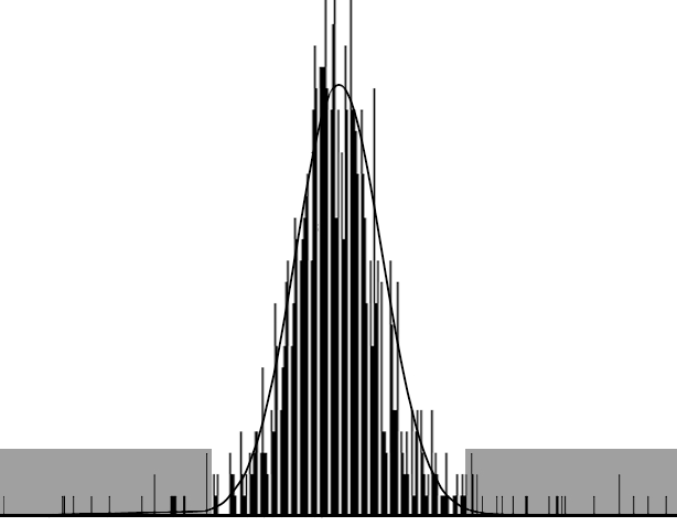 Esta es la distribución del vuelo de Lévy truncado de 1.000 pasos ya expuesto anteriormente. Las zonas grises son las colas y estas son gruesas porque en ellas hay muchos más datos de los que suele haber en una campana de Gauss normal.