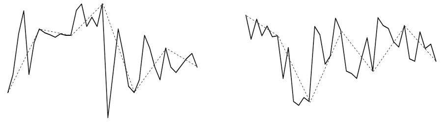 Se creyó durante mucho tiempo que las cotizaciones eran paseos aleatorios y que se generaban con un ruido browniano. Trataré someramente el movimiento browniano de una partícula en el siguiente apartado sobre la dimensión fractal, pero tal movimiento no funciona correctamente para modelizar las cotizaciones. Los primeros cartones los construyó Mandelbrot de un modo semejante a conforme se crea la curva de Koch. Parte de una línea que es la semilla y una línea quebrada, un zigzag, que es el generador. El generador se aplica sobre sí mismo, en cada uno de sus segmentos, iteradamente, mediante transformaciones afines contractivas.