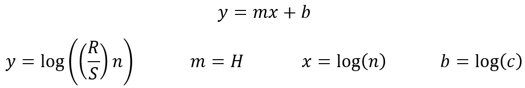 Por tanto, H es la pendiente de una recta o tangente trigonométrica de esta respecto al eje de abcisas. Tal pendiente se obtiene de la recta de regresión de los rangos reescalados respecto de los números de retornos de cada intervalo de las distintas particiones. Sobre papel doblemente logarítmico se dibujan los rangos reescalados respecto del número de retornos de cada partición. Tal representación suele ser una nube de datos que se aglutinan alrededor de una supuesta recta y como la nube de datos se puede dibujar, pues también se puede trazar una línea de regresión y medir o calcular su tangente trigonométrica.