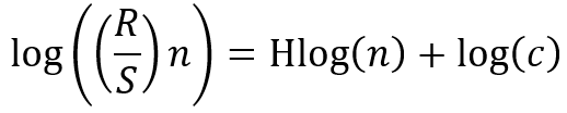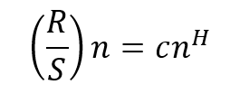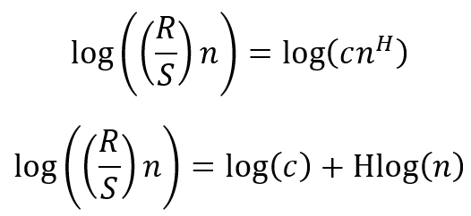 Se tiene que para todas las particiones, el rango reescalado (R/S), multiplicado por el número de retornos de cada intervalo de la partición (n) es igual a una constante (c) que multiplica al número de retornos de cada intervalo de la partición (n) elevado al exponente de Hurst (H). O sea: