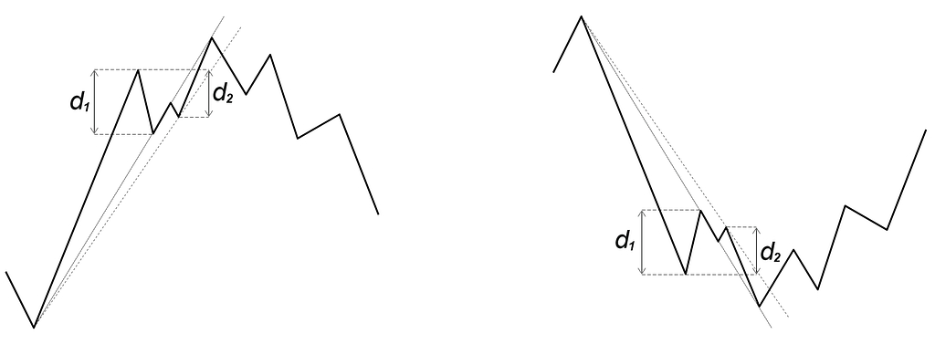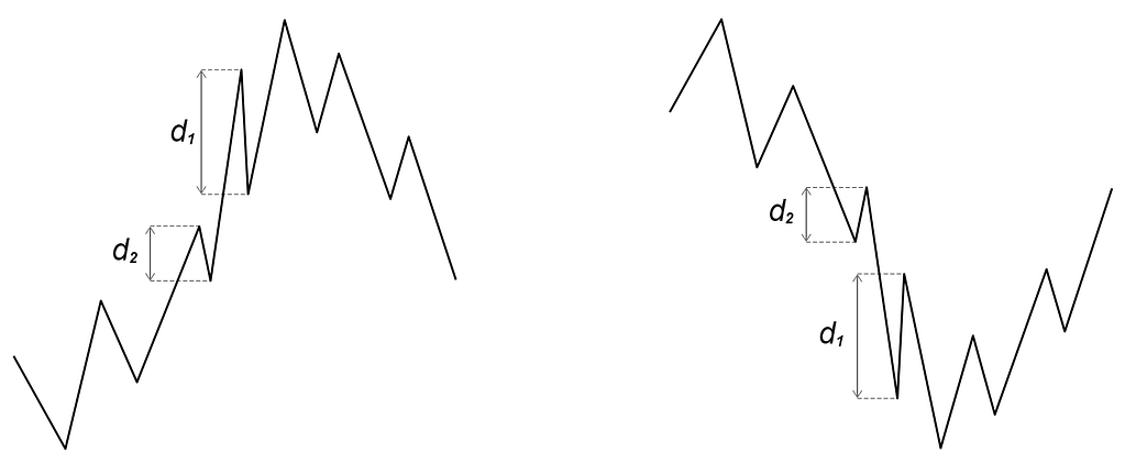 Las directrices trazadas en línea continua muestran claramente que sus prolongaciones a futuro cortan las cotizaciones antes de que se produzca el giro de tendencia. Inicialmente, si no se hubiesen trazado las directrices de línea continua, se considerarían las distancias d1 como las que propondrían homotecias. Sin embargo, hay que trazar las directrices como las dibujadas a trazos discontinuos para deducir las distancias d2. Estas distancias d2 proporcionas posibles objetivos de precio con sus homotecias. La distancia d1 también es posible que proporcione homotecias después que la distancia d2 haya proporcionado algún objetivo.
