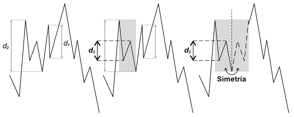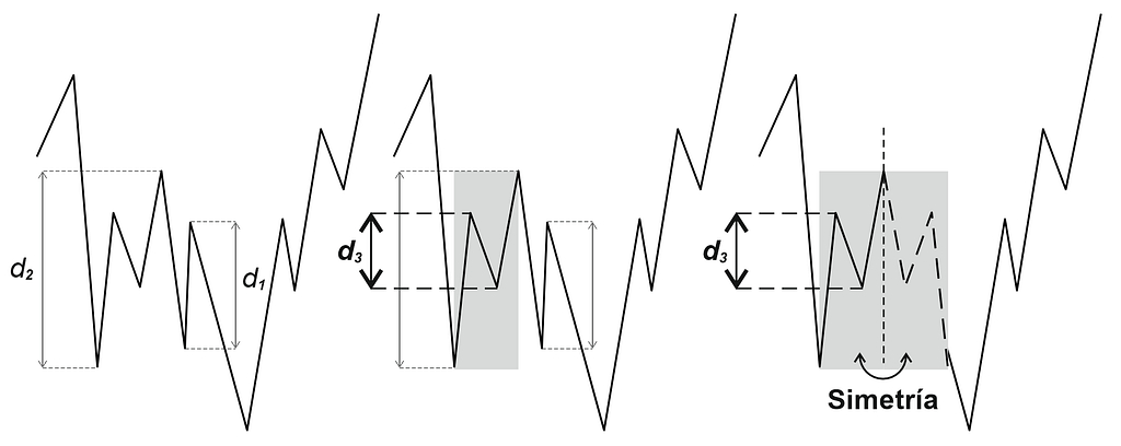 La segunda salvedad del método de las directrices involucra una “simetría”, una “reflexión” en la cotización que suele darse muy a menudo. A veces, en algún lugar donde podamos haber encontrado una distancia d1, que en principio se pueda considerar que proporcionará posibles objetivos de precio con sus homotecias, resulta que existe antes de esa distancia una tendencia que cubre completamente la distancia d1. Toda esa tendencia, además es una distancia d2, también candidata a que sea ella la que en el futuro comience a proporcionar objetivos con sus homotecias. Pero ocurre que esa tendencia anterior que forma la distancia d2 funciona como si estuviese espejada y puede contener tendencias menores en sentido contrario a ella. Esas tendencias menores que encontremos dentro de d2 y en sentido contrario son las distancias d3, d4, d5… que tienen sus homotecias como posibles objetivos y generalmente sus objetivos se dan antes que los que puedan derivarse de d1 y d2.