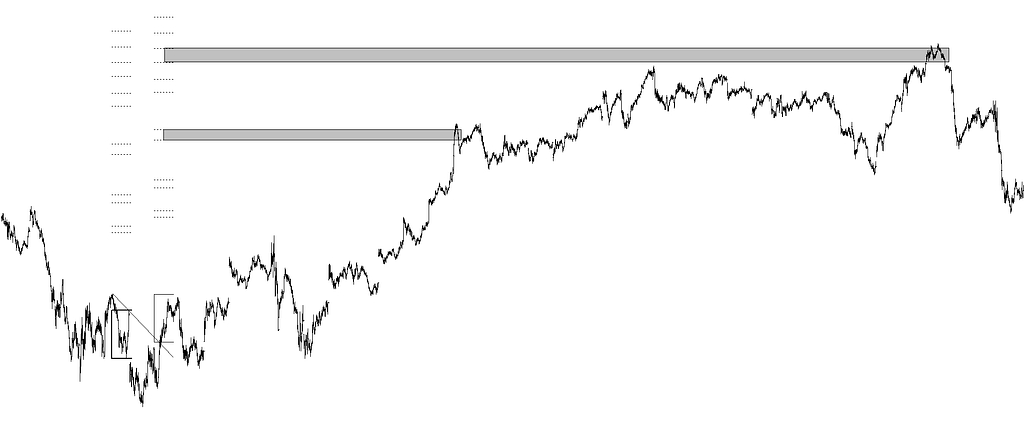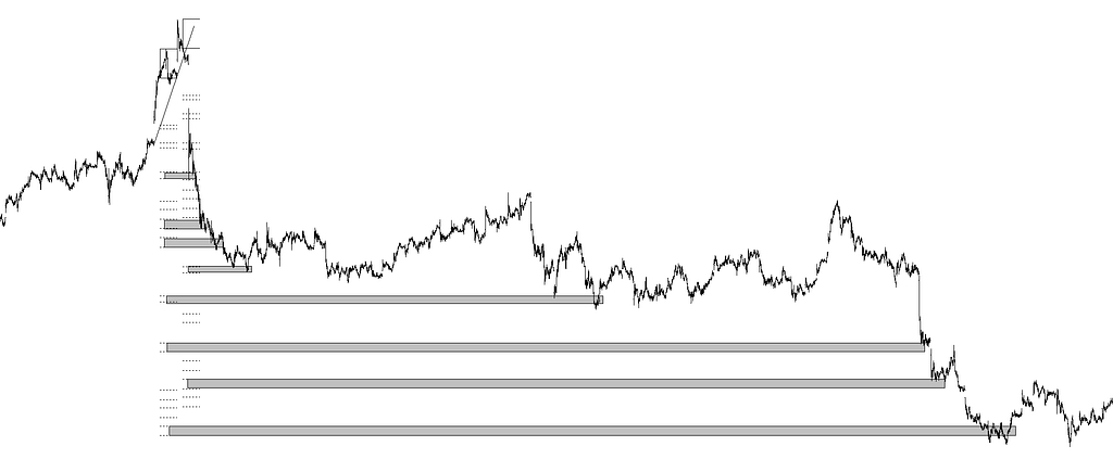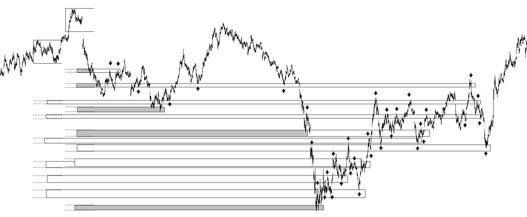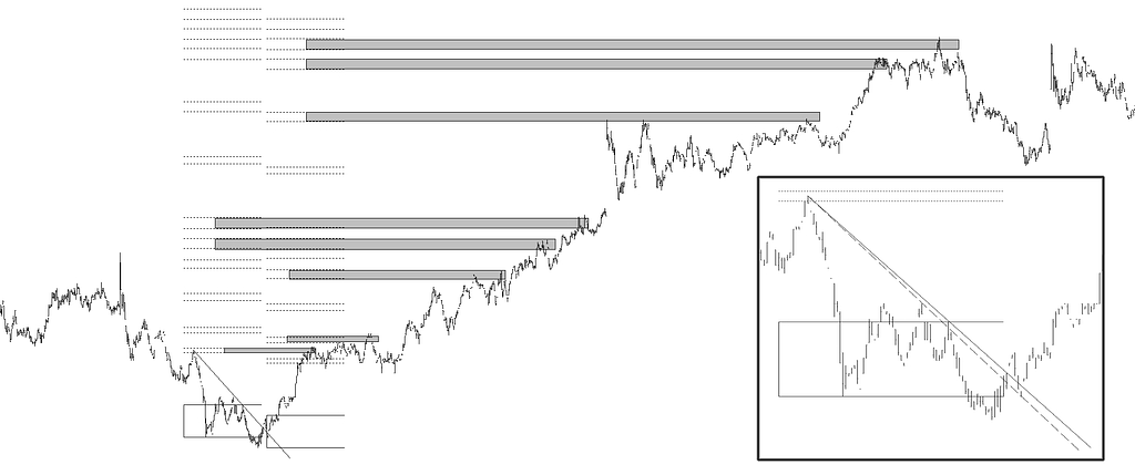 Si los objetivos directos o propuestos como directos, porque la cotización no los ha alcanzado todavía (o quizá no lo haga nunca, porque se anulen o no se alcancen), los dibujo como franjas horizontales, los objetivos diferidos los dibujo vaciados de color, quedando tan solo el contorno de la franja original. No haría falta comentar que a priori no se sabe de un posible objetivo si será directo o diferido, pero una vez la cotización llega al posible objetivo se abren tres posibilidades. La primera es que sea un objetivo directo y se produzca un máximo (o un mínimo). La segunda es que no sea un objetivo directo y pensemos que en algún momento, incluso un poco lejano, la cotización construya un objetivo diferido. La tercera, evidentemente es que en ese posible objetivo no vaya a existir ni un objetivo directo ni diferido.