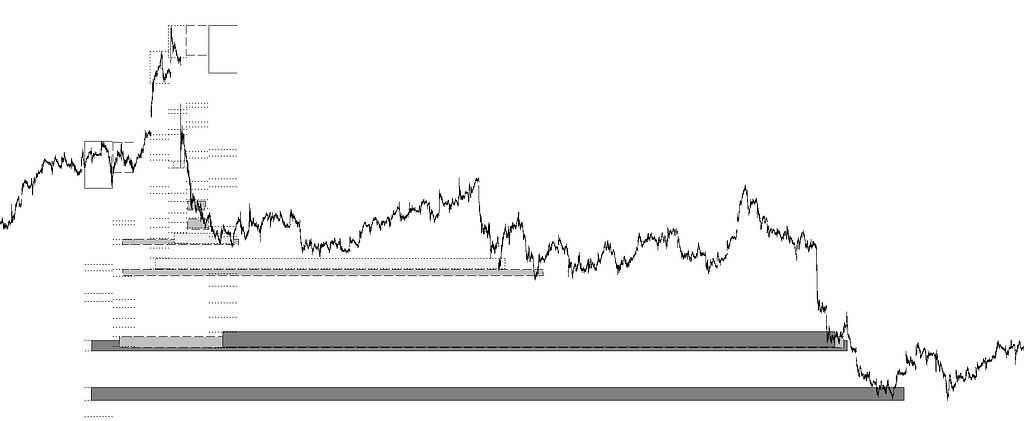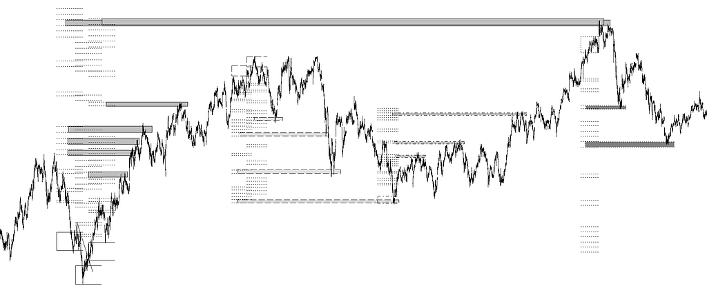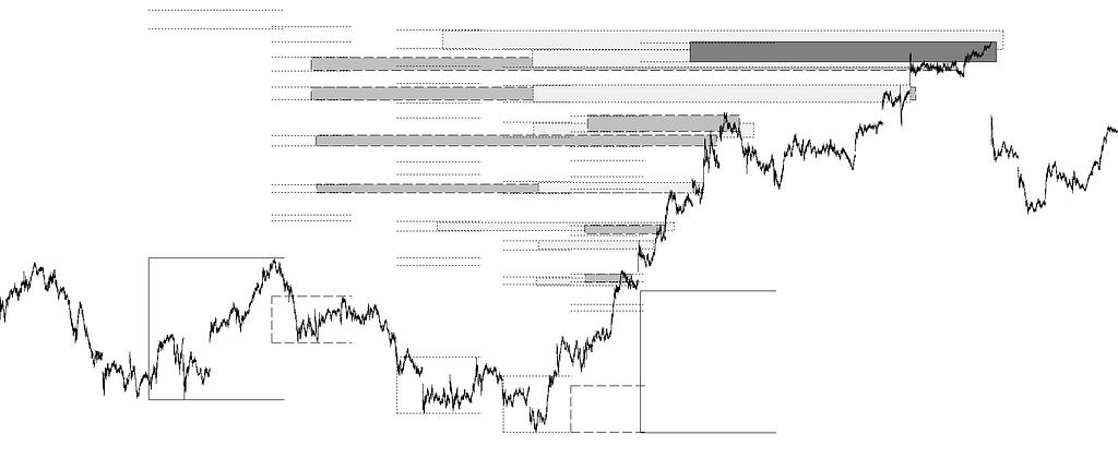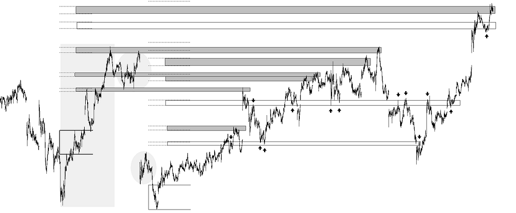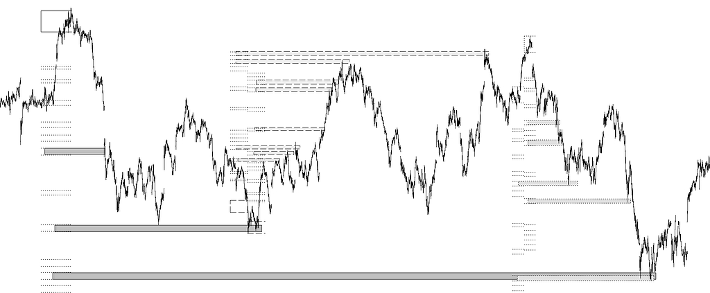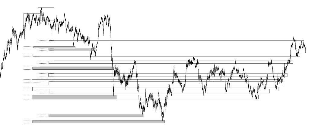 Objetivos directos con sus prolongaciones a futuro actuando como soportes y resistencias, así como objetivos diferidos que actúan también como soportes y resistencia.