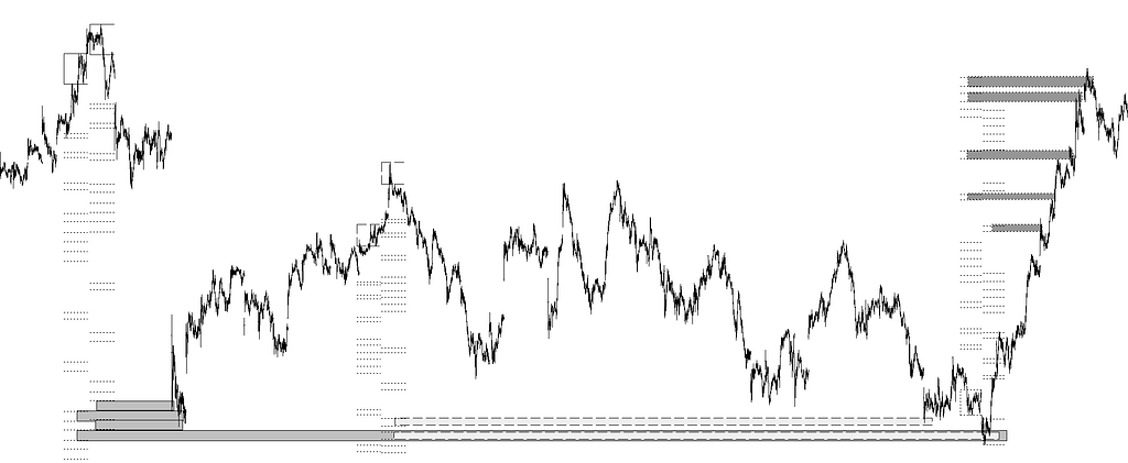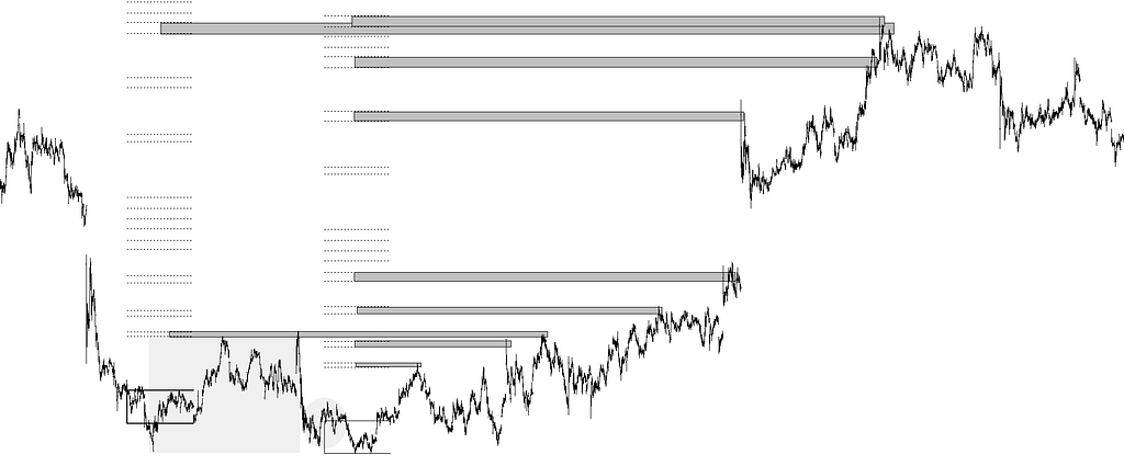 Cada objetivo por este método es resultado de operar los números borrosos y, por tal, son unas zonas borrosas en el precio que dibujo como franjas horizontales. Cada franja dibujada es tan solo la máxima pertenencia del resultado a la recta real; en este caso al precio, y es en cada una de ellas la meseta del trapecio escaleno (que es la forma que tiene cada función de pertenencia de estos objetivos, nacidos de multiplicar una distancia por los elementos números borrosos del conjunto borroso).