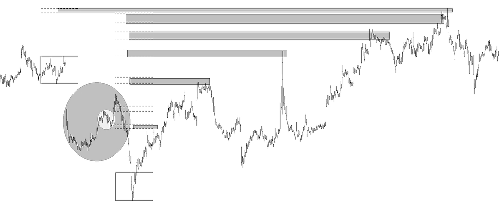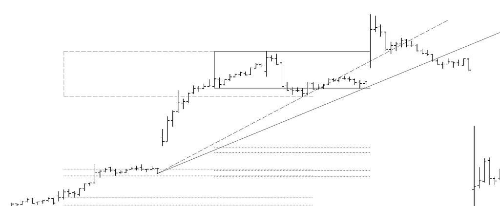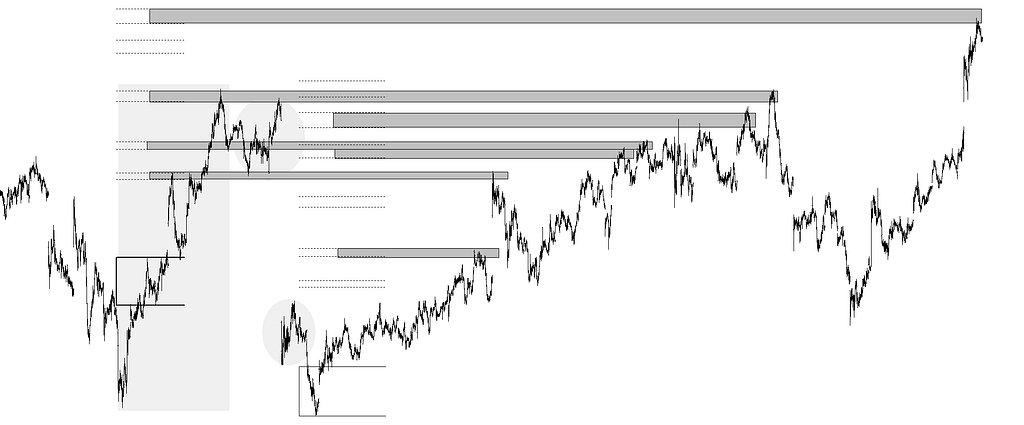 Como en el gráfico anterior, en la elipse gris hay una distancia que pudiera ser candidata a proporcionar objetivos de precio con sus homotecias, pero esa distancia es desbordada por la tendencia anterior. Por tal, ocurre lo mismo, que esa tendencia funciona como espejada y en ella la distancia medida proporciona objetivos directos y por traslado