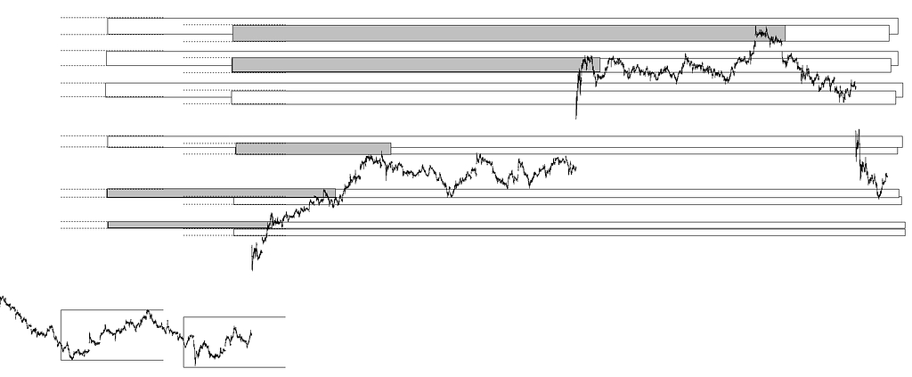 El lector debe abrir su mente y probar constantemente lo que he ido y seguiré explicando, porque son muchas cosas a la vez las que forman la multifractalidad en las cotizaciones, y esas, digamos, “cosas” se combinan coordinándose para producir máximos y mínimos comunes (multiobjetivos). La diferencia entre que las cotizaciones sean conjuntos multifractales o que sean tan solo una mezcla de conjuntos monofractales es la coordinación entre los elementos que la van construyendo. Si no se coordinaran, si no se combinaran no podríamos encontrar posibles máximos y mínimos futuros, porque sería imposible intuir dónde podrían formarse, saber siquiera qué monofractal estaría predominando en un máximo o mínimo ya formado. Sería una cuestión de puro azar dar con ellos. En el apartado de multifractalidad queda bien claro (con los espectros de singularidades o espectros multifractales) la coordinación que obligatoriamente ha de existir en las cotizaciones que poseen un exponente de Hurst distinto en cada tick. Quizá muchos lectores no lleguen a comprender la importancia de ello, pero es ahí donde reside el quid de la cuestión que permite ir averiguando qué cosas intervienen para que se den los máximos y mínimos desde lo aproximadamente fractales que son las cotizaciones.