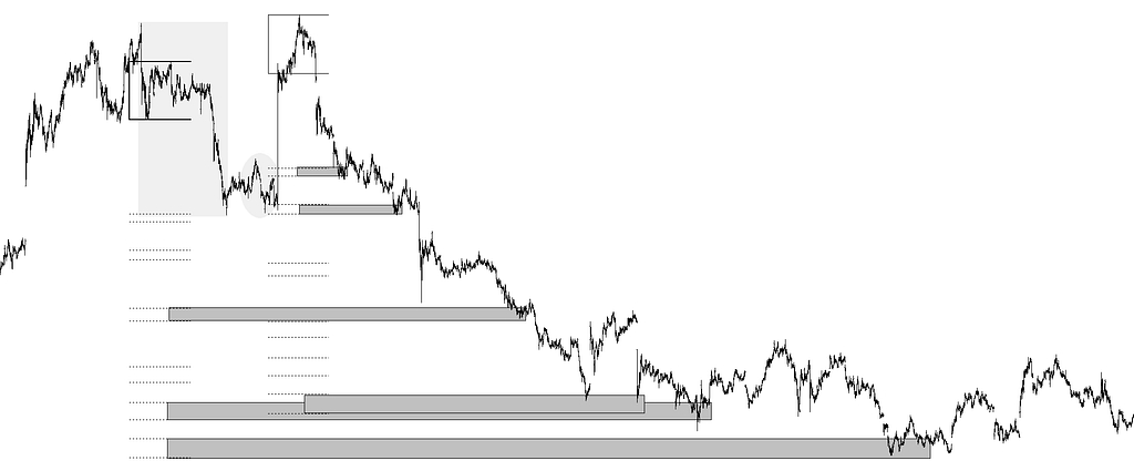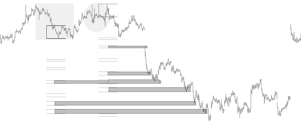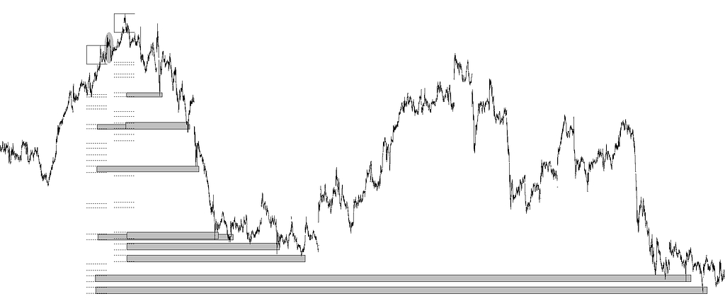 En la elipse gris figura una distancia candidata a proporcionar objetivos con sus homotecias, pero tal distancia queda totalmente desbordada por la tendencia anterior (recuadrada en gris), y esa tendencia funciona cual espejada a los efectos del método de las directrices. Por tal, la distancia tomada con el medidor de trazo más grueso proporciona objetivos con sus homotecias, tanto directamente como trasladando el medidor al máximo donde la cotización gira a la baja