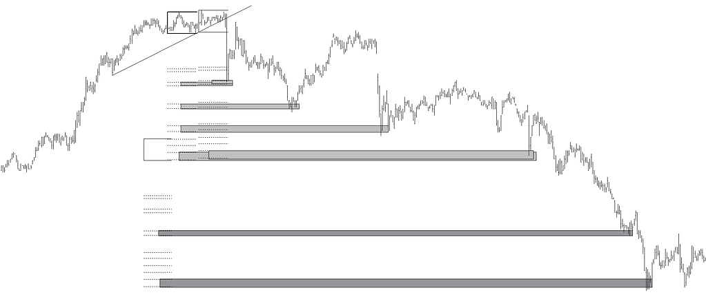 Interviene inicialmente una primera directriz próxima y anterior a un máximo (mínimo), aunque posteriormente pueden intervenir otras directrices conforme se alejan del máximo (mínimo). Tal primera directriz es la más cercana al máximo (mínimo). Me refiero a la directriz última antes de un giro. En procesos de subidas (caídas) tal directriz viene formada por la línea con pendiente positiva (negativa) que une los dos últimos mínimos (máximos) del proceso alcista (bajista) y su prolongación a futuro. La distancia en precio desde el máximo (mínimo) que se encuentra entre los dos mínimos (máximos) de la directriz en procesos alcistas (bajistas) y el segundo mínimo (máximo) de la directriz tiene homotecias. Tal máximo (mínimo), inicio de la distancia que tiene homotecias ha de ser el mayor máximo (menor mínimo) entre los mínimos (máximos) que definen la directriz y ha de ser superior (inferior) al segundo mínimo (máximo) de la directriz.