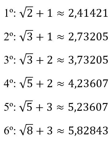 En las secuencias en las que intervienen sumas de 4, 5 y más términos, un límite semejante al descrito va tendiendo a 2, y como veremos más adelante el 200% de ciertas distancias también es un objetivo. Para el caso de la secuencia de 4 términos el límite es 1,927561975… y en el caso de la secuencia de 5 términos es 1,965948237… Pero 2 (200% como homotecia de una distancia) no lo incluyo el conjunto borroso ni en el medidor porque ciertos medidores, como este, pueden auto acoplarse como ya indicaré cuando ello sea así, quedando el conjunto borroso y el medidor simplificado.