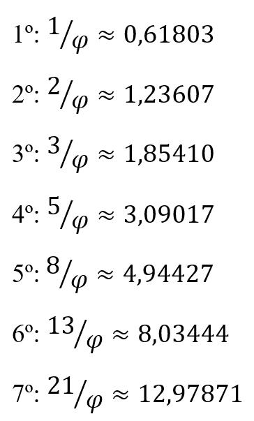 Relaciones de una distancia en precio o una distancia en tiempo basadas en el número inverso de Phi (0,61803…), así como la diferencia entre 1 y este inverso (0,38196…) se ven en muchos lugares en las cotizaciones y son llamadas primer fibo y segundo fibo en el análisis técnico, en la teoría de ondas de Elliott y en otros intentos de estudio de las cotizaciones. Así mismo, proyecciones de una distancia en precio o tiempo como son el propio Phi (1,61803…), Phi más su inverso (2,23606…) o 1 más Phi (2,61803…) también aparecen en la teoría de ondas de Elliott y en diversas disciplinas dentro análisis técnico, pero proyecciones más allá de esta última cifra no suelen emplearse y muchas veces ni conocerse. Generalmente superar una proyección del 2,61803… suele expresarse como algo que ocurre, pero no se cuantifica qué proyecciones pueden ser ni cómo son. En alguna ocasión, como en ciertos patrones del “Operador armónico” de Scott Carney sí se formulan claras proyecciones por encima de 2,61803…