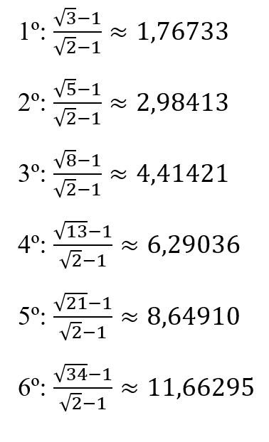 En el primer conjunto borroso intervienen cálculos con el número Phi y algunos elementos son suma de otros elementos adicionándole 1 o 2. Realicé cálculos con las raíces cuadradas de los números de la secuencia de Fibonacci sumando 1 y 2, pero al final resultó que los números borrosos de este quinto conjunto borroso se construyen así: