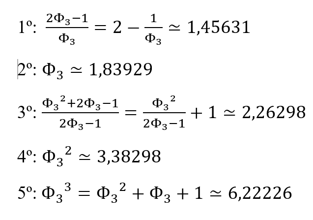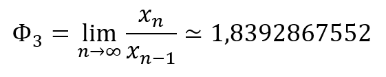 Ocurre como en la secuencia de Fibonacci y el número φ=Φ2 (Phi mayúscula sub 2), que existe un límite como resultado de la división de un término por el anterior cuando estamos próximos al término infinito. Este límite es Φ3 (Phi mayúscula sub 3).