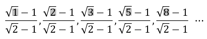 La construcción de este conjunto borroso me fue un poco compleja. Estuve experimentando muchas cosas entre los números de la secuencia de Fibonacci, con sus raíces cuadradas, con los de Tribonacci y sus raíces, y al final ocurrió que una secuencia alterada de los números de la de Fibonacci, pero en sus raíces cuadradas funcionaba. La siguiente secuencia en la que cada número sombreado es cada término de la secuencia de Fibonacci son los números borrosos de este cuarto conjunto borroso:
