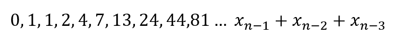 La secuencia de Tribonacci, se construye igual de la de Fibonacci, pero con la suma de los tres términos anteriores. Otras secuencias se hacen con cuatro, cinco… anteriores términos, pero estas no tienen nombre. Tribonacci no es nadie, pero la secuencia que lleva tal nombre se forma de modo parejo a la de Fibonacci. En ella cada término a partir del cuarto es suma de los tres anteriores. La secuencia de Tribonacci toma el nombre combinando tres y Fibonacci y es la siguiente: